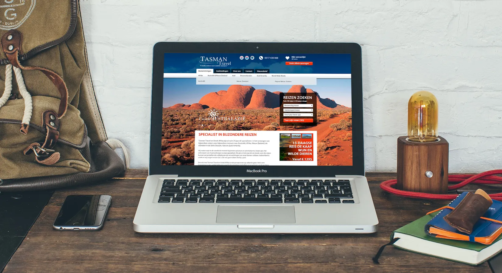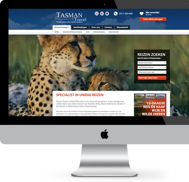 De maatwerkwebsite is uiteindelijk net zo uniek geworden als de reizen die Tasman Travel aanbiedt en is naast beeldend ook vooral fuctioneel. Blader makkelijk door het reisaanbod en boek je droomreis!